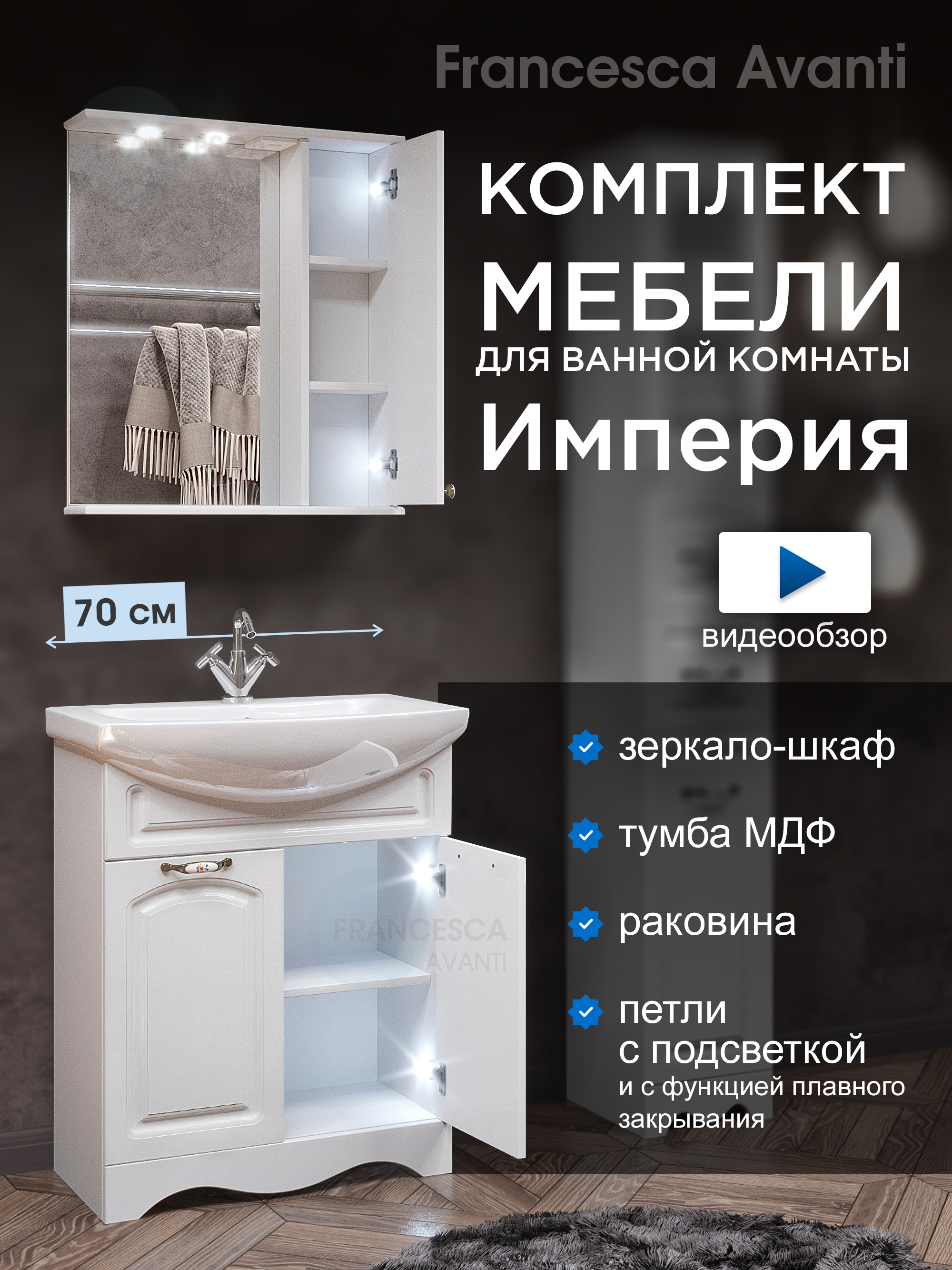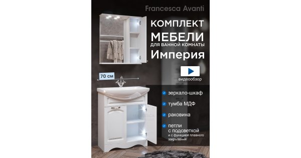 Если вы любите комфорт, выбирайте комплект мебели для ванной 70 см. Наборы мебели, которые демонстрирует данный раздел, помогут удобно обустроить помещение и сформировать гармоничный интерьер для релаксационного отдыха. В их составе имеется комфортный умывальник, установленный на тумбе, и широкое зеркало. В большинстве наборов оно закреплено в единой конструкции с подвесным шкафом. Внутри можно разместить все необходимые в ванной вещи. Для упорядоченного их хранения имеются полки. Дополнительное удобство обеспечивает комплект для ванной комнаты Франческа 70 см, в тумбе которого обустроены выдвижные ящики или бельевая корзина.