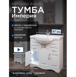 Шкаф-зеркало Francesca Империя 85 органично дополнит классический интерьер. Мебель из ДСП и МДФ покрыта белой пленкой, защищающей древесину от влаги. На выбор покупателя доступно два варианта расположения шкафчика: слева или справа от зеркала. Модель сочетается с пеналом, напольной или подвесной тумбой одноименной серии.